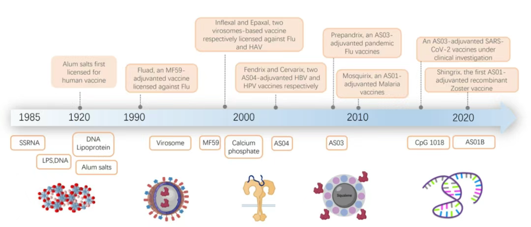 疫苗佐剂研究领域自20世纪初成立以来取得了显著进展。随着传染病越来越普遍,免疫接种已成为限制其传播和减少相关危害的最有效方法。然而,早期的疫苗往往被证明是无效的,因为单独纯化的抗原无法引发足够强的免疫反应。为了克服这一挑战,人们在疫苗中引入了佐剂,佐剂是添加到疫苗中以增强其免疫原性的材料,从而增强它们的有效性。