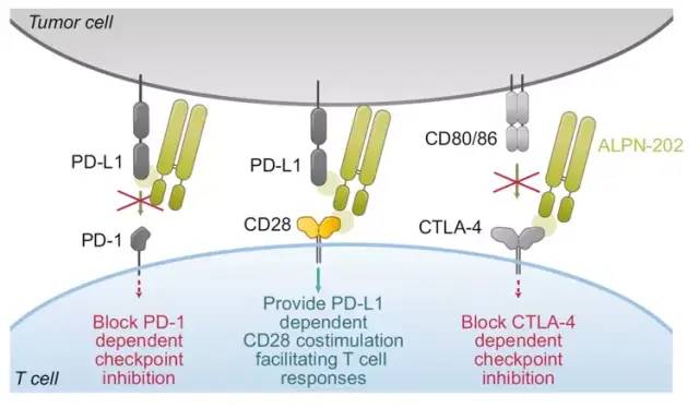 Davoceticept (ALPN-202)是一种用于治疗癌症的条件性CD28共刺激和双检查点抑制剂,该免疫疗法将PD-L1依赖性CD28共刺激与PD-L1和CTLA-4双重抑制结合在一种重组蛋白疗法中。CD28作为T细胞激活过程中关键性的共刺激受体,它的配体是CD80和CD86。免疫检查点蛋白PD-1与CTLA-4就是通过干扰CD28的信号通路来抑制T细胞的免疫反应。