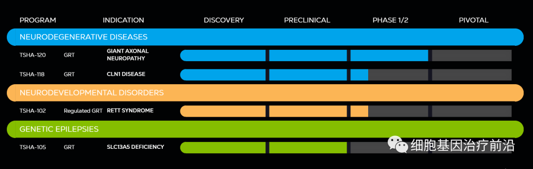 两种基因疗法分别是:TSHA-102, TSHA-120,前者是Rett综合征临床开发中第一个也是唯一一个基因疗法;后者是一种鞘内给药的AAV9基因替代疗法,用于治疗巨轴索神经病(GAN),目前处于 1/2 期开发阶段。