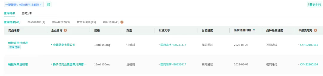 2023年3月,中润药业的帕拉米韦注射液获批上市,成为国内首仿。同年6月,扬子江药业集团四川海蓉药业获批,视同过评,成为国内第二家获得该品种仿制批文的企业。
