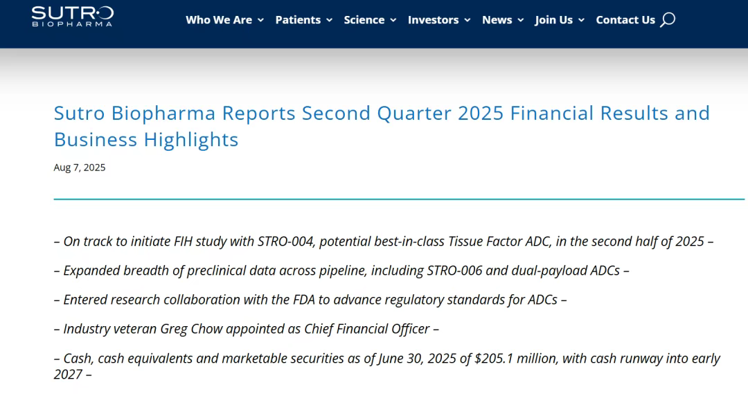 彼时的Sutro还在经历断臂求生的阵痛,而近日,Sutro Biopharma公布了其2025 Q2的财务业绩和业务亮点,展示了其ADC产品管线的重大进展,似乎前景明朗了起来。