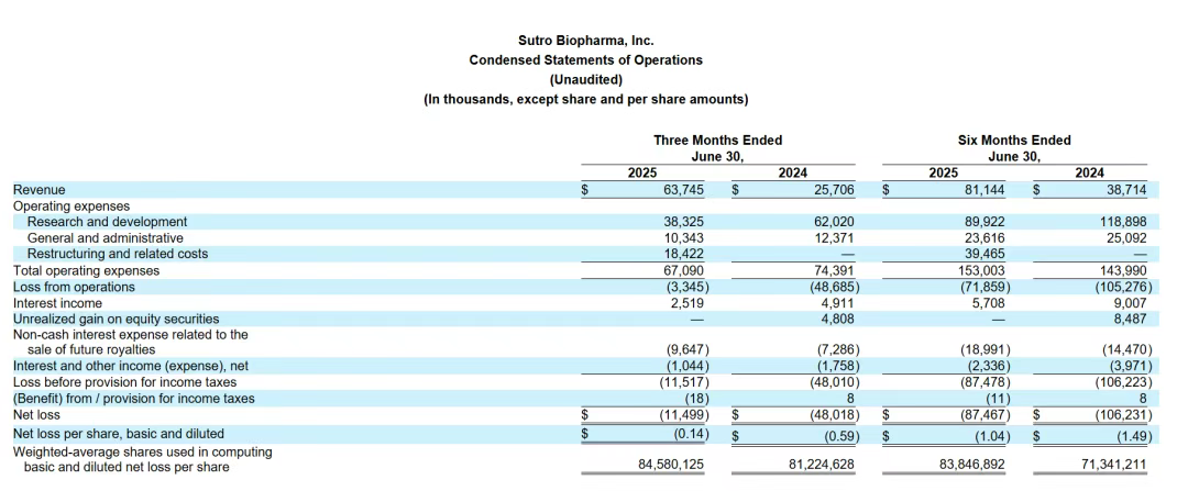 2025 H1,Sutro营收8114.4万美元,同比增长110%;2025 Q2,Sutro营收飙升至6375.5万美元,同比增长148%,这得益于与安斯泰来(Astellas)的合作,以及益普生(Ipsen)决定不再推进STRO-003项目而确认的递延收入。尽管项目受挫,但这一大幅收入增长彰显了Sutro技术平台的价值。