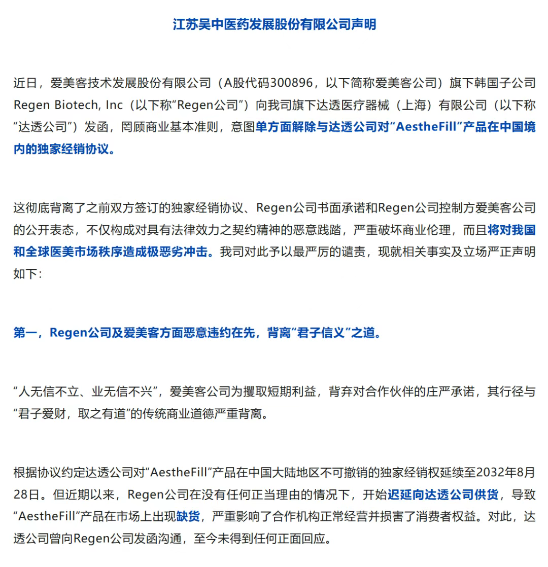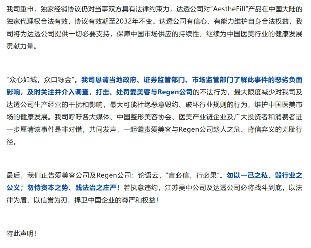 2022年,老牌药企江苏吴中通过孙公司达透医疗,一举拿下了韩国Regen公司研发的AestheFill(艾塑菲)在中国大陆的十年独家代理权,合同有效期至2032年8月。