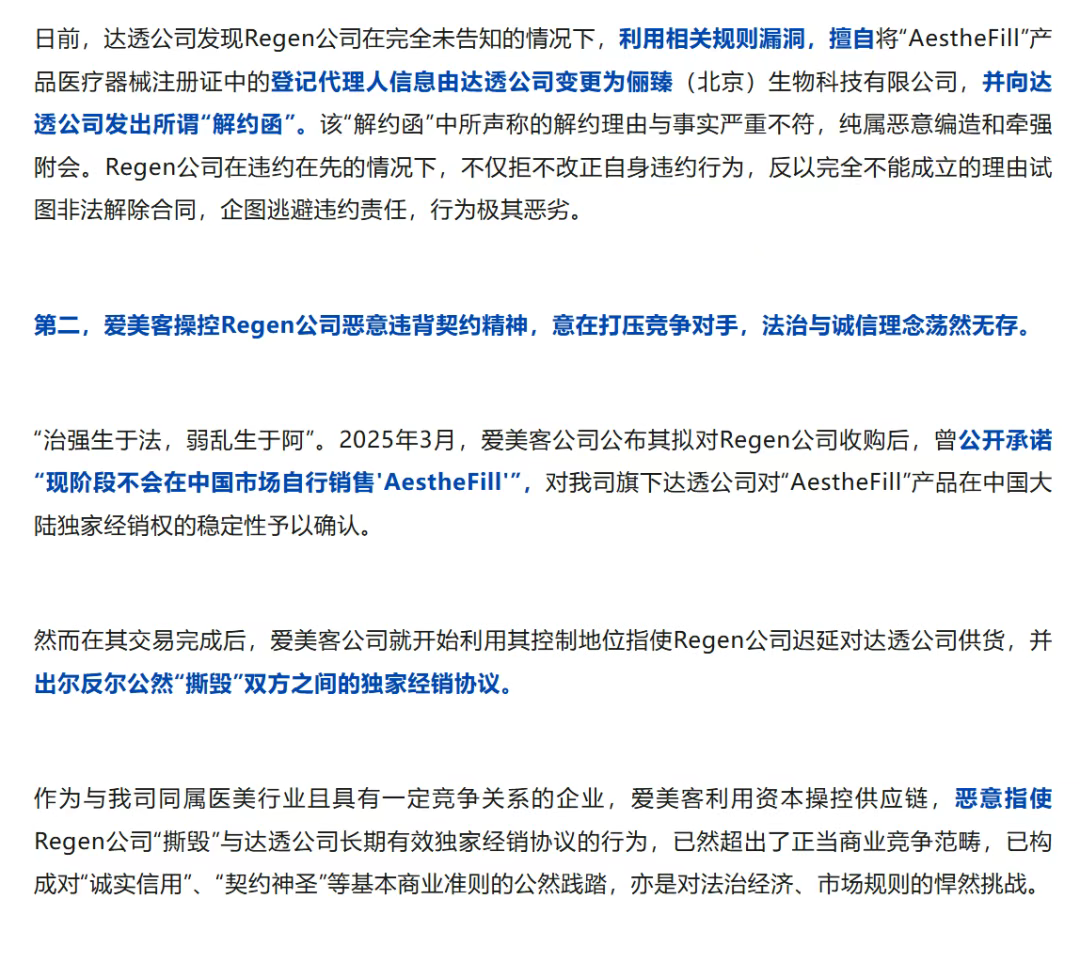 然而,故事很快急转直下。2025年3月,爱美客收购了Regen,变成江苏吴中的“上游”。