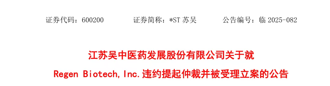 今日,江苏吴中医药公告称:公司控股孙公司达透医疗器械(上海)有限公司(下称“达透医疗”)就Regen Biotech, Inc.违约事项向深圳国际仲裁院提起仲裁,并于2025年8月7日获得受理立案。