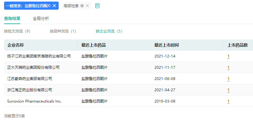 盐酸鲁拉西酮片国内获批情况(按企业浏览)