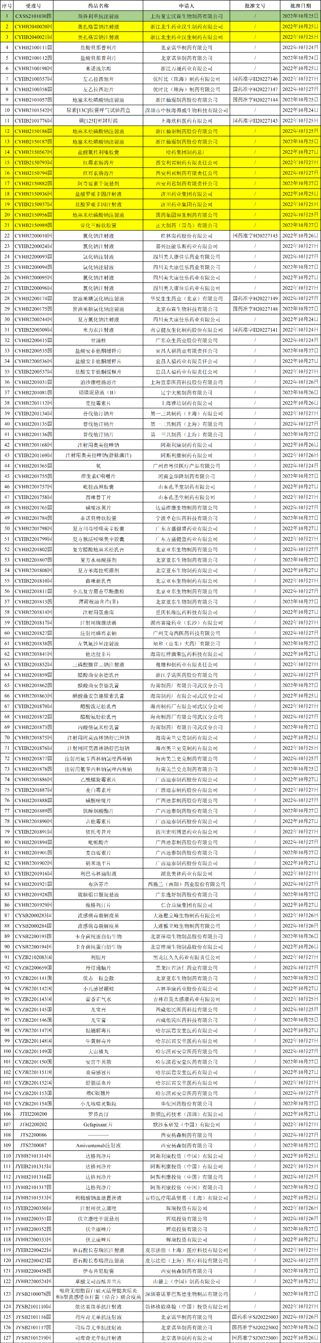 2022年10月31日,NMPA发布药品批准证明文件待领取信息,本次共有127个受理号获批,其中12个为一致性评价受理号,包括: