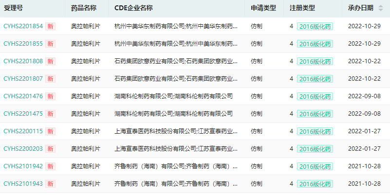 国内奥拉帕利仿制申报上市概况(微信搜索"药融云小程序"进行相关更多数据查询)