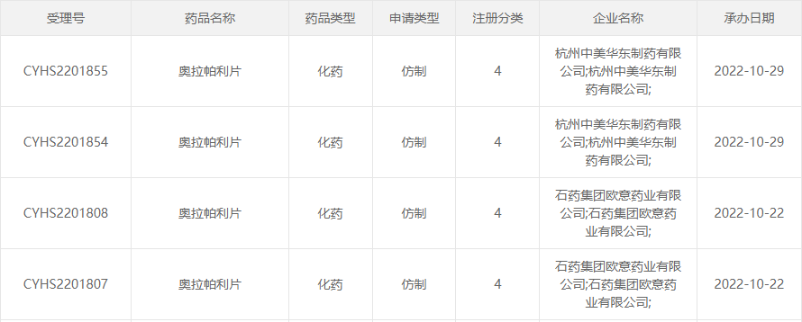 目前,奥拉帕利为阿斯利康的独家品种,国内尚无其他仿制药获批上市。奥拉帕利的化合物专利在2024年3月到期,制剂专利在2029年10月到期,用途专利在2024年11月到期。但国内已有多家明星药企陆续报产入局,包括齐鲁制药(首家报产)、宣泰医药、湖南科伦、石药欧意以及此次的杭州中美华东制药,均在审评审批中,该重磅卵巢癌靶向新药的国内首仿药花落谁家尚待揭晓。此外,重庆药友制药、江西山香药业和南京方生和医药等药企也已开展奥拉帕利的BE试验。