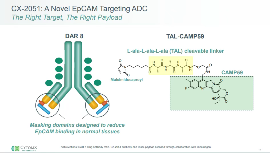 CX-2051是一款具备条件激活机制的掩蔽型ADC候选药物,靶向EpCAM(上皮细胞黏附分子)。CX-2051搭载的是一种下一代拓扑异构酶-1抑制剂载荷,具体是一种下一代喜树碱类似物偶联载荷,其连接子经过优化,旨在发挥旁观者效应。