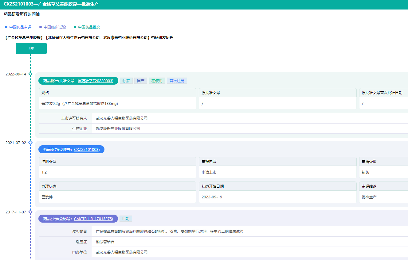 广金钱草总黄酮胶囊研发历程时间轴(微信搜索"药融云小程序"查看更多维度数据分析)