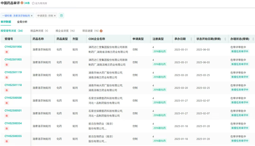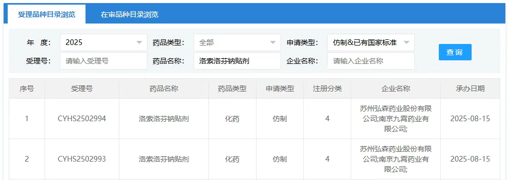 8月15日,CDE官网显示,苏州弘森药业和南京九霄药业联合申报的洛索洛芬钠贴剂上市申请已获受理。据摩熵医药数据库显示,2024年洛索洛芬钠院内销售额超25亿元,该剂型尚无仿制药获批上市,已有15家企业参与首仿争夺。