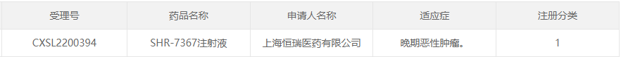 其中注射用SHR-A2102、注射用SHR-A1811、注射用SHR-1802、注射用SHR-1501、SHR-7367注射液、SHR-1701注射液、SHR-1316注射液、HRS-6209胶囊、HRS-4642注射液、HRS-1358片、HRS-1167片等均为抗肿瘤药物,涵盖膀胱癌、直肠癌、乳腺癌、肺癌等多个癌种。
