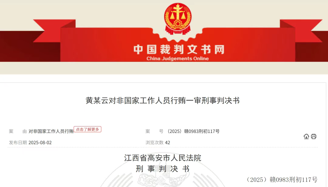 近日,裁判文书网发布了一份江西高安法院的判决书,某配方颗粒代表黄某云向18名医生支付回扣,累计行贿192.6万元,最终因对非国家工作人员行贿罪被判处有期徒刑三年(缓刑三年),并处罚金5万元。