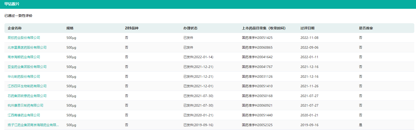 甲钴胺片通常用于治疗周围神经病和缺乏维生素B12导致的巨红细胞性贫血,该药在我国院内的销售峰值曾达到近十亿,近两年出现暴跌,2021年院内销售额仅不到5亿,市场主要由卫材占领,其次是青峰药业领衔国内药企。截至目前,共有10家药企陆续拿下仿制药过评,其中扬子江药业集团南京海陵药业于2019年9月斩获甲钴胺片国内首家。