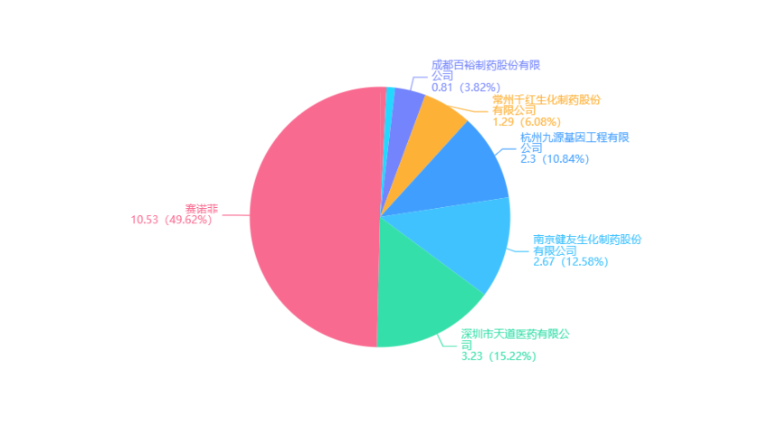 根据药融云数据库显示,目前国内有10余家药企获批生产依诺肝素钠注射液。在一致性评价方面,加上此次最新仿制药过评的辰欣药业(《重磅低分子肝素抗凝剂!2品种最新通过仿制药一致性评价》),现已有深圳天道医药(首家过评)、山东新时代药业等8家药企过评。其中,2021年在国内销售市场上较为领先的有深圳市天道医药(15.22%)、南京健友生化(12.58%)和常山生化制药(6.08%)。