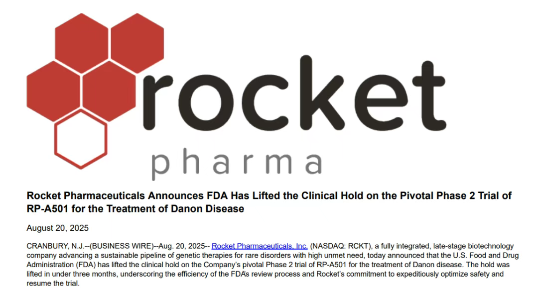 2025年8月20日,致力于为高需求罕见病开发可持续的基因疗法管线的Rocket Pharmaceuticals宣布,美国食品药品监督管理局(FDA)已解除对其关键性2期试验RP-A501(用于治疗Danon病)的临床暂停。
