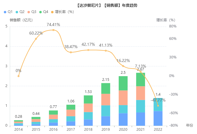 达沙替尼片近年来院内销售额稳步增长,2021年约为2.7亿元。目前共有石药欧意(首家过评)、正大天晴和此次达成一致性评价满3家的山东新时代药业过评。除此之外,齐鲁制药、昆山龙灯瑞迪制药和南京圣和药业开展有达沙替尼的BE试验。