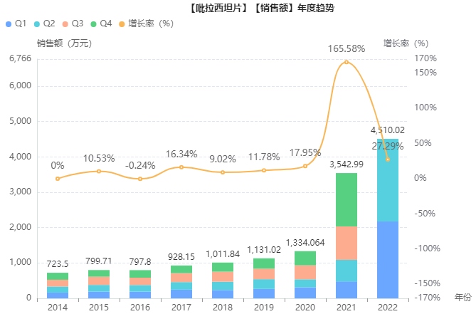 但近年来,吡拉西坦片的销售额飞速上涨,市场急速扩张。据药融云统计,吡拉西坦片今年上半年院内销售额已超去年全年,同比增长315%,预计今年能突破亿元大关。