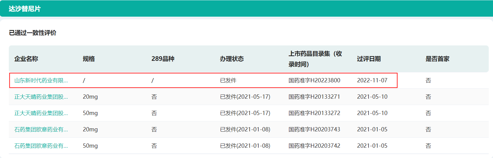 据药融云一致性评价审评进度数据库显示,近期又有2款药物一致性评价满3家,分别为吡拉西坦片和达沙替尼片,过评企业为东北制药与山东新时代药业。