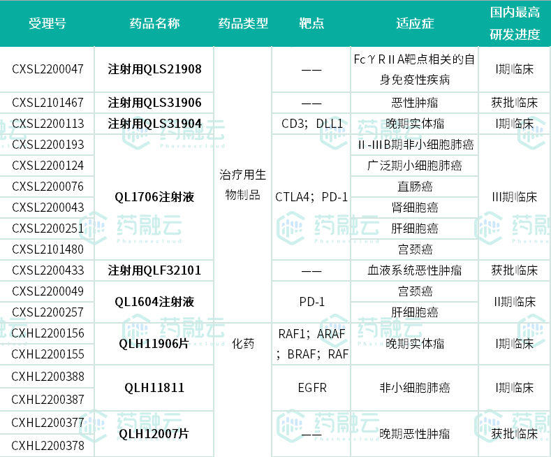 截至目前,齐鲁制药今年共有1款1类新药申报上市(受理号:CXHS2101032、CXHS2101031),为依鲁奥克片(WX-0593),预计用于治疗非小细胞肺癌;9款1类新药获批临床(默示许可),多数为抗肿瘤药物,其中QL1706注射液最高已至临床III期阶段。