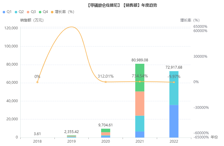 甲磺酸仑伐替尼胶囊是一种酪氨酸激酶抑制剂,原研由卫材开发,又称“乐伐替尼”。2018年仑伐替尼进入中国市场,打破索拉非尼长期独占一线肝癌市场的局面。2021年,卫材的仑伐替尼全球销售额近13亿美元。