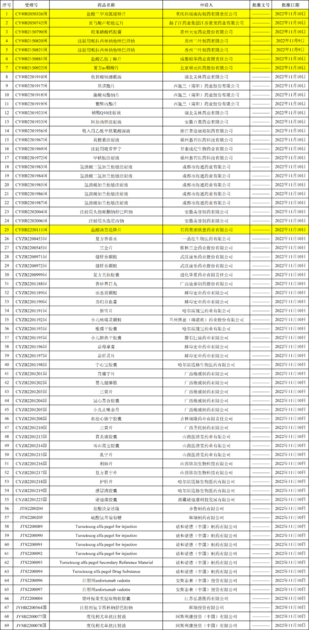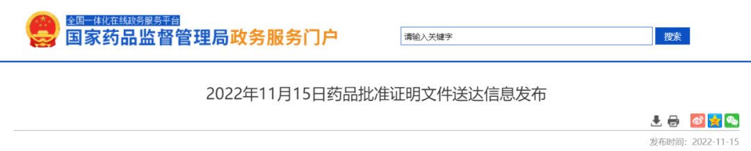 NMPA发布2022年11月15日药品批准证明文件送达信息,69个受理号获批,其中8个一致性受理号获批,包括: