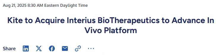 8月21日,吉利德(GILD)旗下Kite公司宣布,已签署最终协议,将以3.5亿美元(折合人民币约25亿元)现金收购Interius BioTherapeutics(以下简称“Interius”),该公司专注于开发可在体内生成CAR-T细胞和CAR-NK细胞的体内细胞疗法(in vivo cell therapy)。