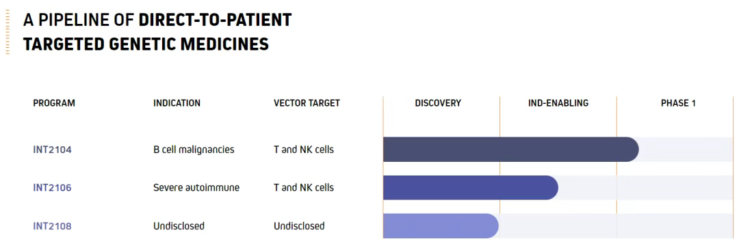 Interius的研发管线还包括INT2106,该生物技术公司正将其开发为一种重置免疫系统的方法, potentially用于治疗由自身抗体产生引起的一系列自身免疫性疾病。该临床前候选疗法可导致体内产生CAR T和CAR NK细胞,以靶向表达CD19蛋白的疾病驱动性B细胞。第三个项目发现阶段的INT2108的靶点和潜在适应症尚未披露。