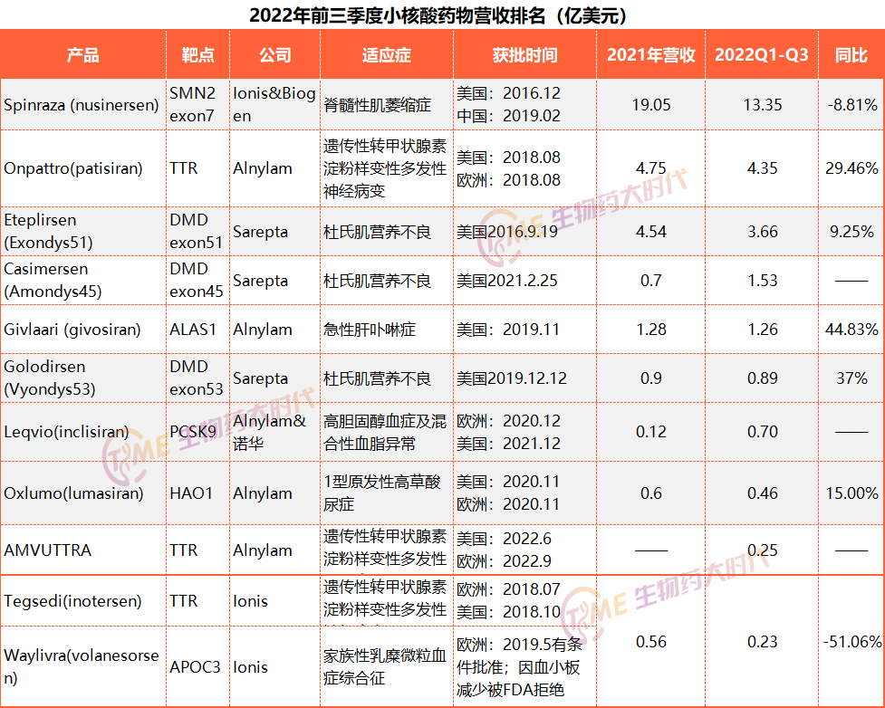 据药融云数据统计,2019年全球核酸药物的市场售额为19.19亿美元,2020年全球小核酸药物销售额在30亿美元左右,同比增长36.3%。2021年全球小核酸药物营收32.5亿美元。根据最新财报,我们统计了2022年前三季度,全球上市小核酸药物营收合计约26.68亿美元(2022年前三季度小核酸药物营收排名!合计约26.68亿美元)。