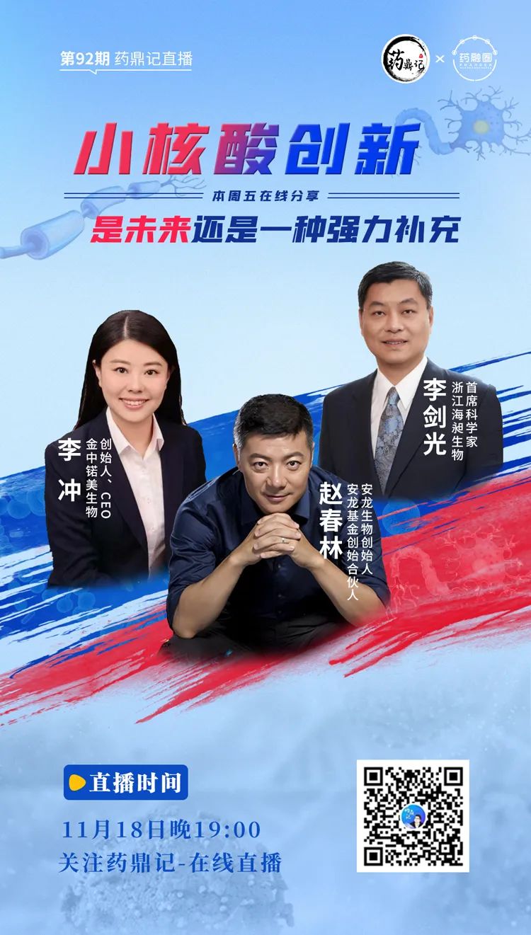 11月18日19点,“药鼎记直播间”邀请了3位嘉宾,为大家带来”小核酸创新“干货分享,他们分别是: