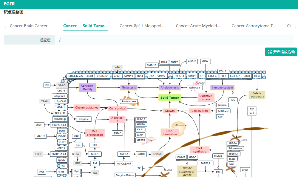 此外,数据库还收录了大量与之相关的通路信息,可直观地看到通路中作为靶点的蛋白,以及对应的药物和适应症信息。这在研究药物新作用、药物重定位,以及开发新药物靶点时是非常有价值的信息。