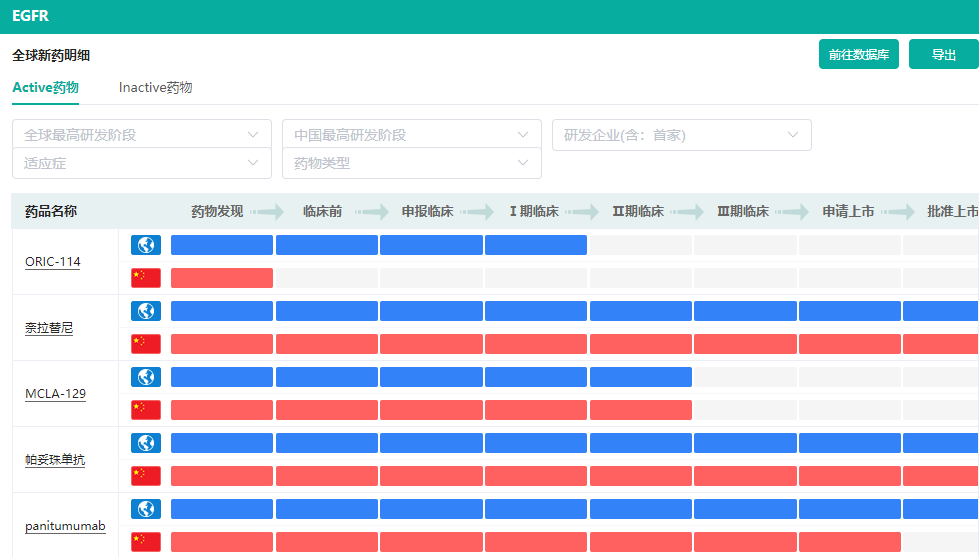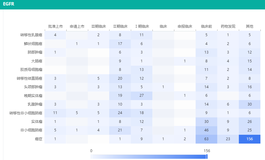 通过【靶点格局数据库】中的适应症研发进程热力图,可以看到,在具体的癌种中,非小细胞肺癌/转移性非小细胞肺癌是研发最为集中的适应症,也是相关EGFR靶向药物获批上市最多的适应症。其次,乳腺癌、转移性直肠癌、头颈部肿瘤等也有数款EGFR靶向药物获批上市。