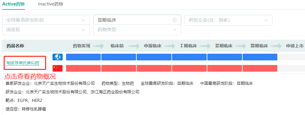与此同时,【靶点格局数据库】提供全球最高研发阶段、中国最高研发阶段、研发企业、适应症、药物类型等筛选项,大家可以从2255条EGFR靶向药物中精准筛选。点击药物名称,可查看药物基本情况(研发企业、适应症、最高研发阶段等)。