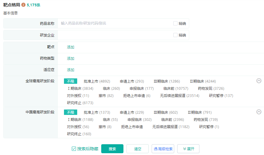 为此,药融云数据库重磅上线【靶点格局数据库】,归纳整理了全球各靶点药物的信息,方便大家更快速直观地了解到全球靶点药物研发格局。包括全球同靶点新药研发信息、适应症和企业在各研发阶段的药物数量、以及国内同靶点药物和企业在各申报进度的数量。