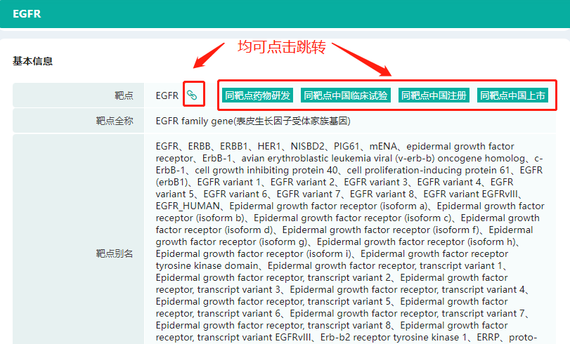 在基本信息板块,可查看药物靶点的全称、别名、靶点层级关系和众多靶点通路图。同时,我们设置了多个链接,可一键跳转对应数据库查看相应信息,省去手动跳转+搜索的步骤和时间。