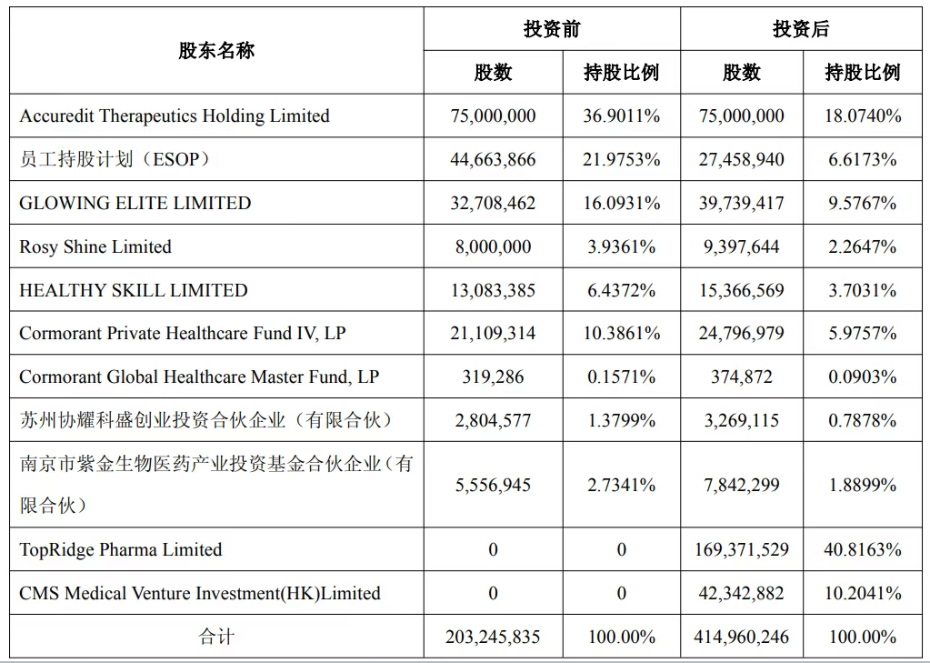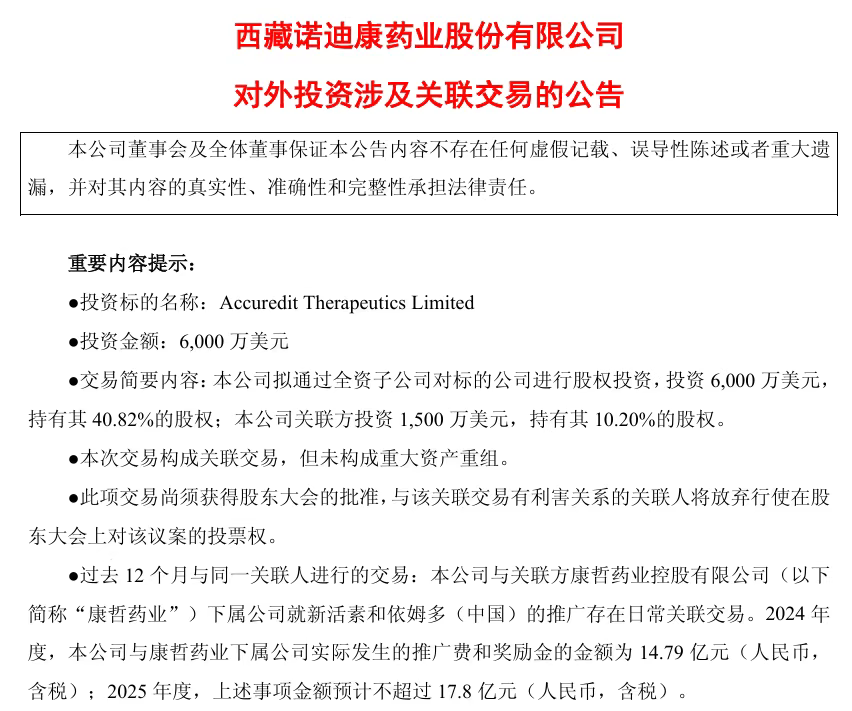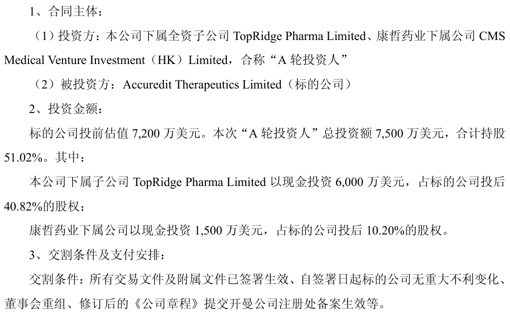 8月27日晚,西藏药业披露,为了公司可持续发展,突破研发瓶颈,公司拟通过在香港设立的全资子公司TopRidge Pharma Limited 对AccureditTherapeutics Limited进行股权投资,投资金额6,000万美元,持有其40.82%的股权。公司大股东关联公司CMS Medical Venture Investment(HK)Limited(以下简称“康哲药业下属公司”),投资1,500万美元,持有其10.20%的股权。