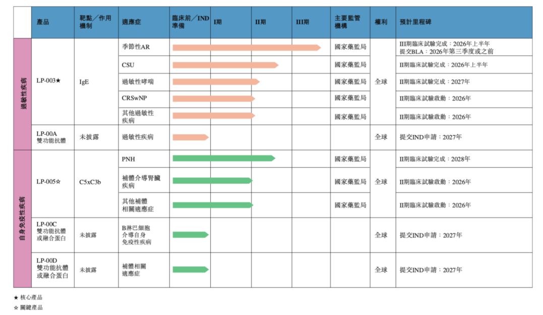 据摩熵医药数据库可知,核心候选分子LP-003是一种具有新型序列设计及同类最佳潜力的下一代创新抗IgE抗体,旨在治疗过敏性鼻炎(AR)、慢性自发性荨麻疹(CSU)、过敏性哮喘及其他过敏性疾病。LP-003的主要功能是中和血液和组织中的游离IgE,从而抑制IgE介导的过敏反应的发生。LP-003能够结合游离IgE,阻止该等游离且过量的IgE与高亲和力IgE受体FcεRI结合。正在中国进行LP-003用于季节性过敏性鼻炎适应症的III期临床试验,并计划在2026年第三季度或之前向国家药监局提交BLA,申请批准上市。