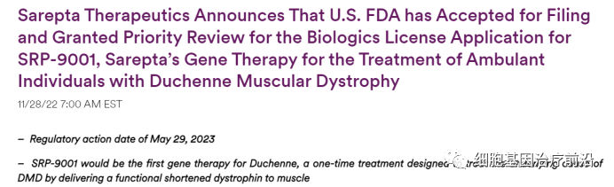 “我们很高兴地宣布,FDA已接受Sarepta 的 SRP-9001 BLA进行备案和优先审查,”Sarepta Therapeutics总裁兼首席执行官Doug Ingram说,“杜氏肌营养不良症是一种无情的退化性疾病,并且总是致命的,它每天每时每刻都在剥夺儿童的肌肉和功能。我们提交的 BLA 加速批准,以及FDA接受该BLA进行备案和审查,是我们努力尽快为杜氏肌营养不良症患者带来可能改变生命的基因疗法的一个极其重要的里程碑,我们期待着通过审查过程与FDA合作。”