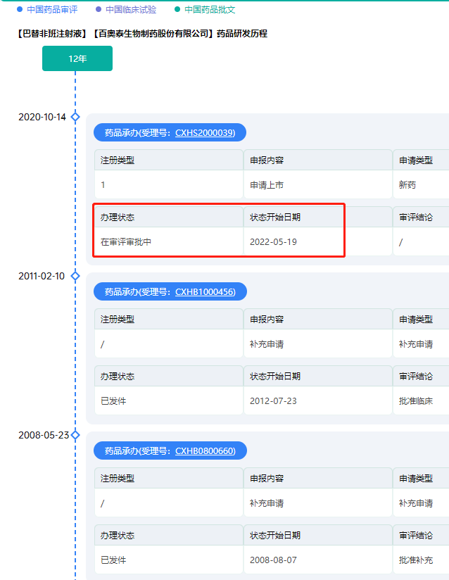 巴替非班注射液药品研发历程(微信搜索"药融云小程序"进行相关更多数据查询)