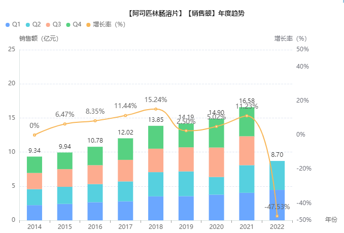 据药融云统计,作为抗血栓药物,阿司匹林肠溶片近年来销售额一路走高,2021年院内销售额超16亿元,2022年依旧保持着一定的增长速度,是2022年H1抗血栓药物市场的TOP4品种。