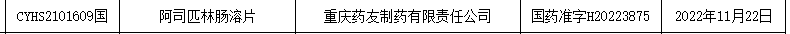 11月29日,NMPA发布2022年11月29日药品批准证明文件送达信息,其中,重庆药友制药的阿司匹林肠溶片成功获批上市,视同通过仿制药一致性评价。重庆药友制药将作为该16亿品种国内第三家获批企业,入局300亿抗血栓药物市场。