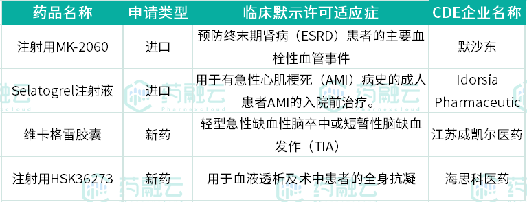 与此同时,今年还有默沙东的注射用MK-2060、Idorsia PharmaceuticalsLtd的Selatogrel注射液、江苏威凯尔医药的维卡格雷胶囊,以及海思科医药的注射用HSK36273等4款1类新药获批临床(默示许可),具体适应症见下表。
