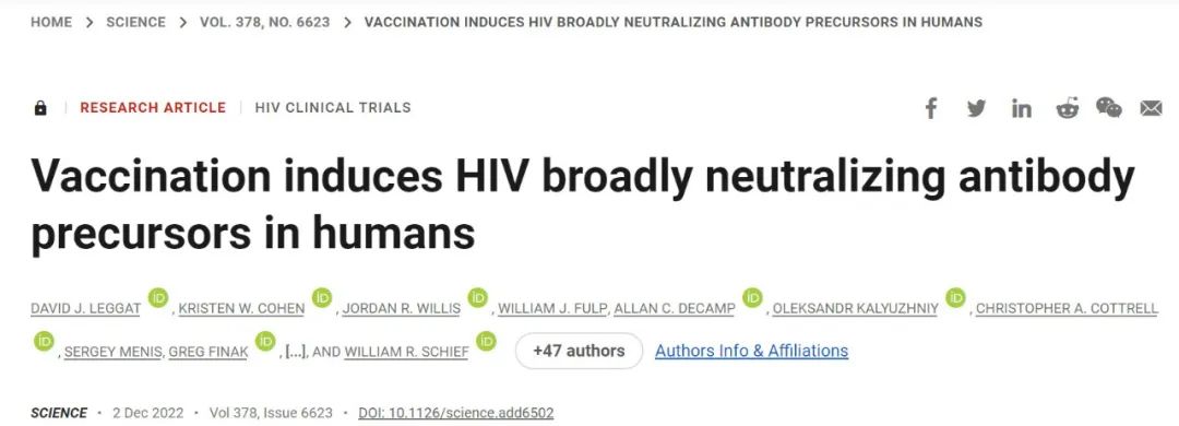 2022年12月2日,由国际艾滋病疫苗倡议协会(IAVI)宣布启动的人体I期临床试验IAVI G001在《Science》杂志上发布其试验结果,这种名为eOD-GT8 60mer的候选HIV疫苗具有良好的安全性,在36名接种者中,97%(35人)产生了广泛中和抗体(bnAbs)。