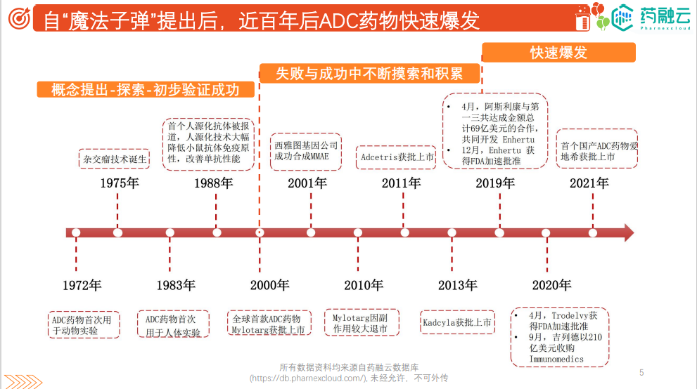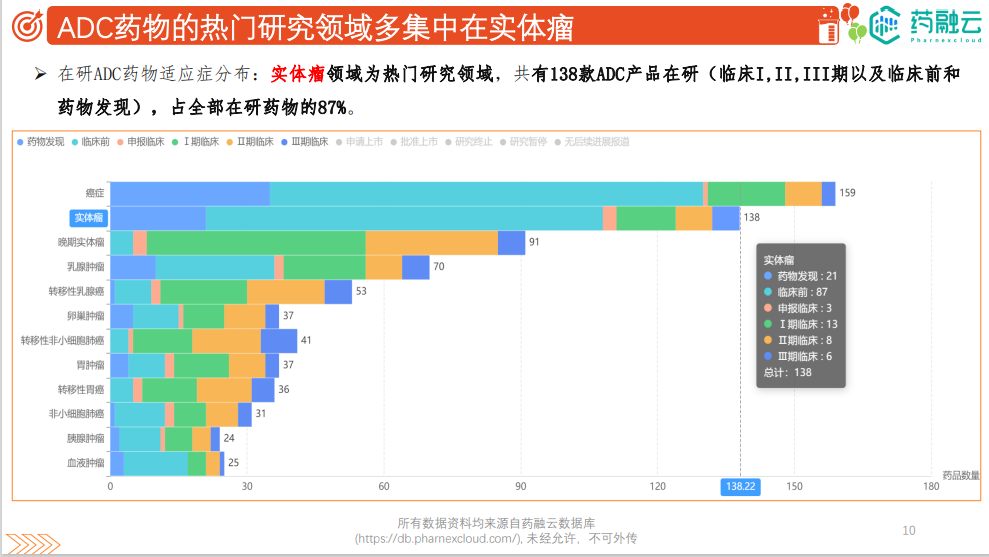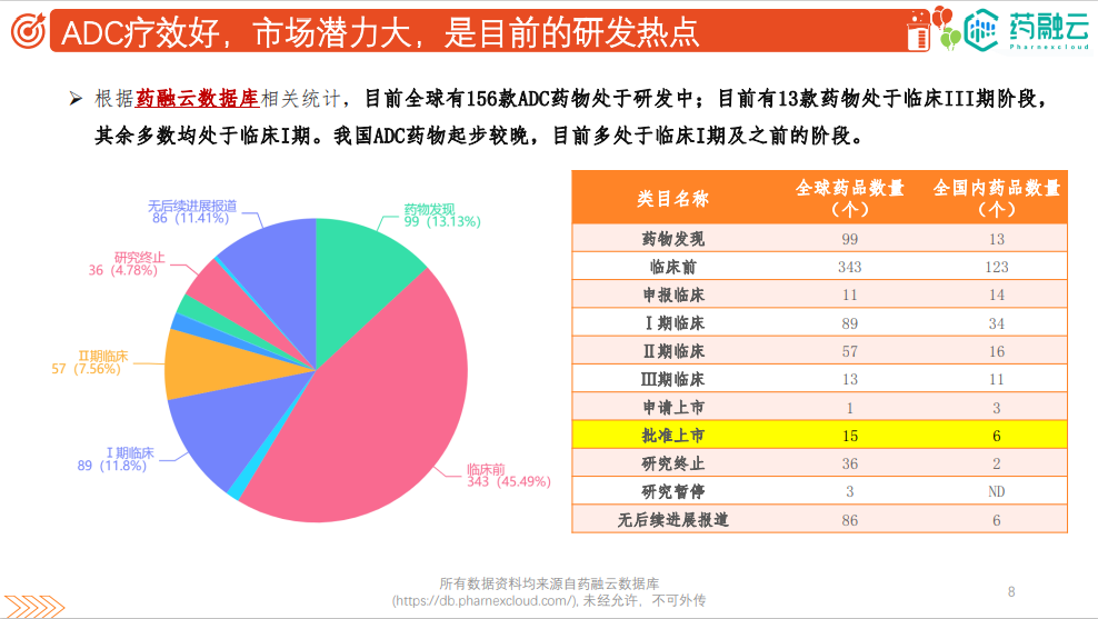 庞大的市场规模、超乎预期的临床成功、技术平台的研发创新,高效推动ADC创新药物从实验室研发迈向产业化和商业化。据药融云数据,目前全球有156款ADC药物处于研发中,处于III期阶段的ADC候选药物超过10款,预计国内在未来2-3年内即将迎来ADC药物的爆发期。
