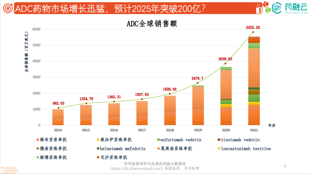 自ADC这一概念提出后,经过ADC药物赛道上的玩家们在失败与成功中不断摸索和积累,目前全球已有15款ADC药物获批上市(《全球获批上市的15款ADC药物大盘点!国内在售5款,涉及罗氏、辉瑞》)。与此同时,ADC药物市场也快速爆发,增长迅猛,有机构预测,到2025年,ADC药物全球市场规模将增至200+亿美元。