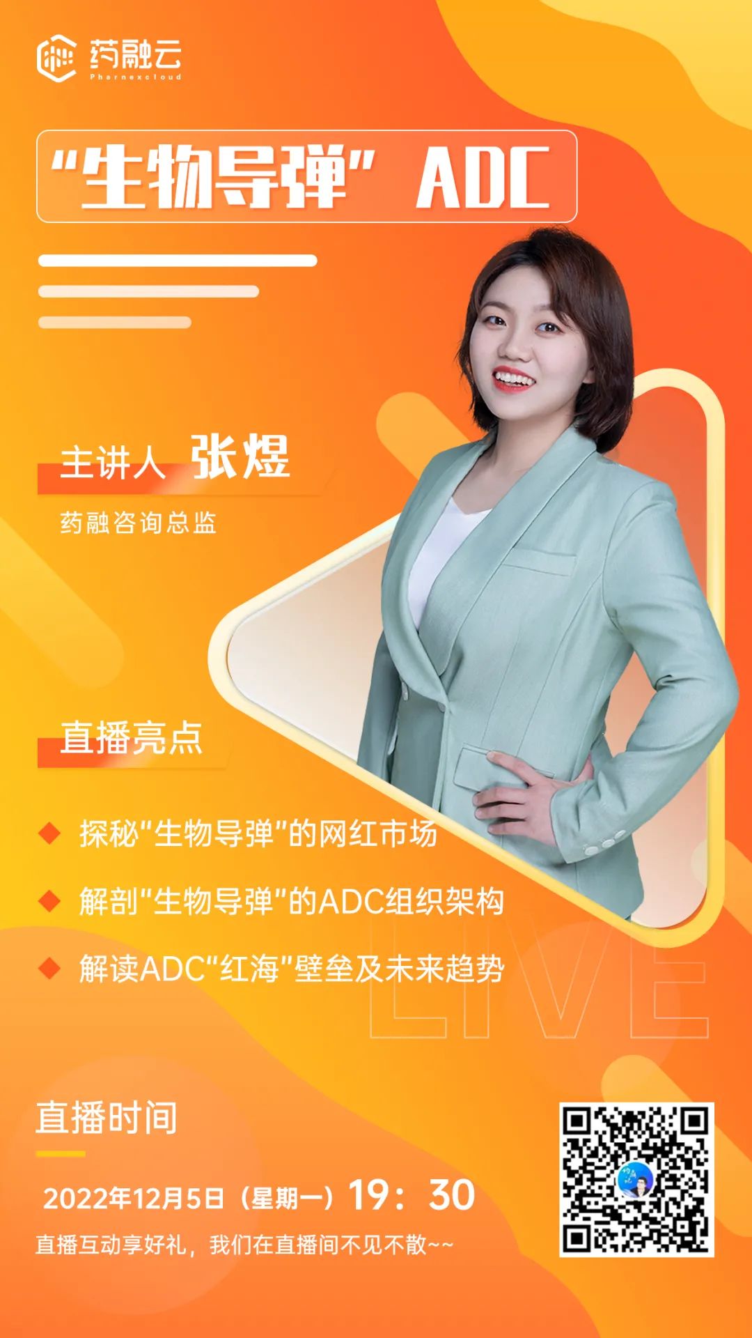 药融咨询团队高级咨询分析师张煜将于⏰12月5日(周一)晚19:30,在药鼎记直播间,和大家分享《“生物导弹”ADC》!欢迎各位前来共同讨论!