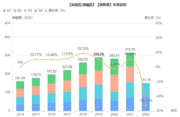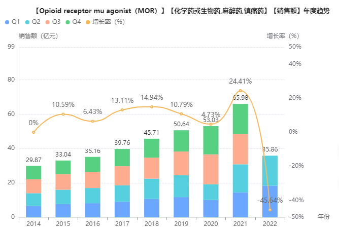 据药融云数据库统计,2021年中国麻醉及镇痛市场销售额超300亿元,2017至2021年复合增长率为9.32%;其中阿片类药物2021年院内销售额为66亿元人民币,2017至2021年复合年增长率为13.5%,增长速度超过整个麻醉镇痛领域平均增速。