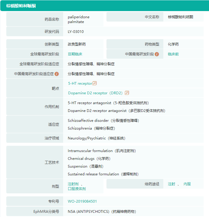 据悉,LY03010是一种缓释混悬注射液,每月给药一次,以肌肉注射的方式用于精神分裂症和分裂情感性障碍的治疗。据公告内容,目前全球所有已上市用于治疗精神分裂症的长效注射剂中,以棕榈酸帕利哌酮为主要成分产品的市场销售额最高,占比达60%以上。2021年,该类型药物全球销售额为40.22亿美元;2022年前三季度,全球销售额为31.32亿美元。