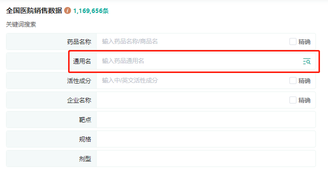 同时,药品销售数据库群下的全国医院销售数据、全国医院销售(全终端)、全国药店零售数据、全国样本医院销售数据,四个子数据库还新增了【通用名】搜索功能;并且,查询结果列表和导出功能,也增加了【通用名】字段的数据展示与下载,方便全局分析同一药品不同生产企业的销售趋势与竞争格局。